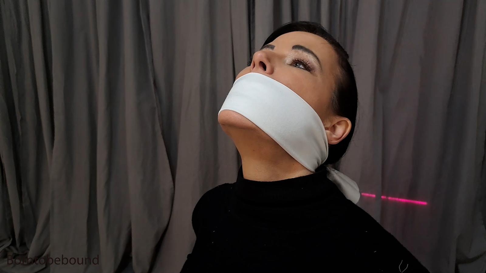 Then poof she is tied spread eagle with a little ballgag in her mouth. She struggles weakly enjoying the situation for a while. She kicks off a patent leather stiletto and arches her pantyhose clad feet. Then she finds a stocking going into her mouth and a piece of microfoam over her face. She now finds herself tied into a ball with the hosiery. Then she finds a black piece of fabric going over the gag. She struggles weakly in room 101, what will happen next…