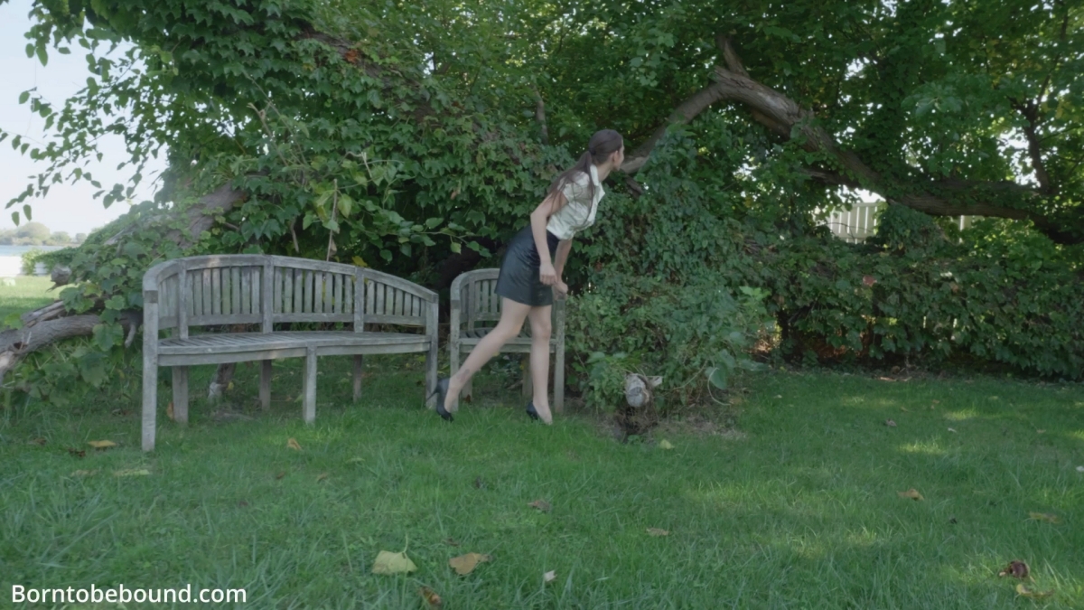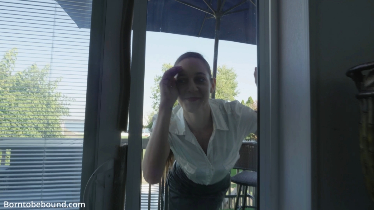 Trixie E is snooping around in a womans back yard looking like she doesn’t belong there wearing heels, satin blouse and skirt. The woman is watching her on camera and when she gets close enough the woman subdues the trespasser and drags her away.