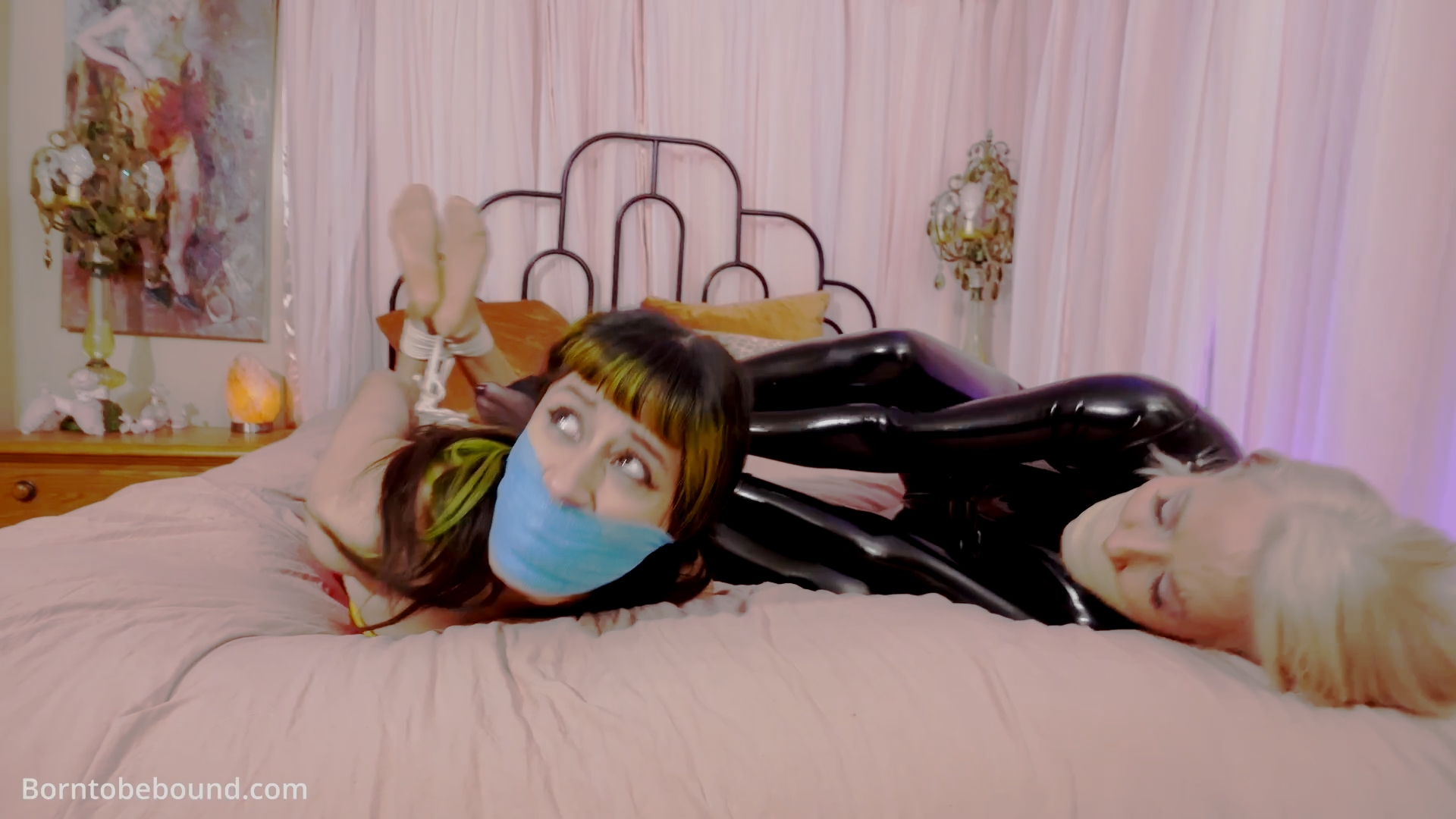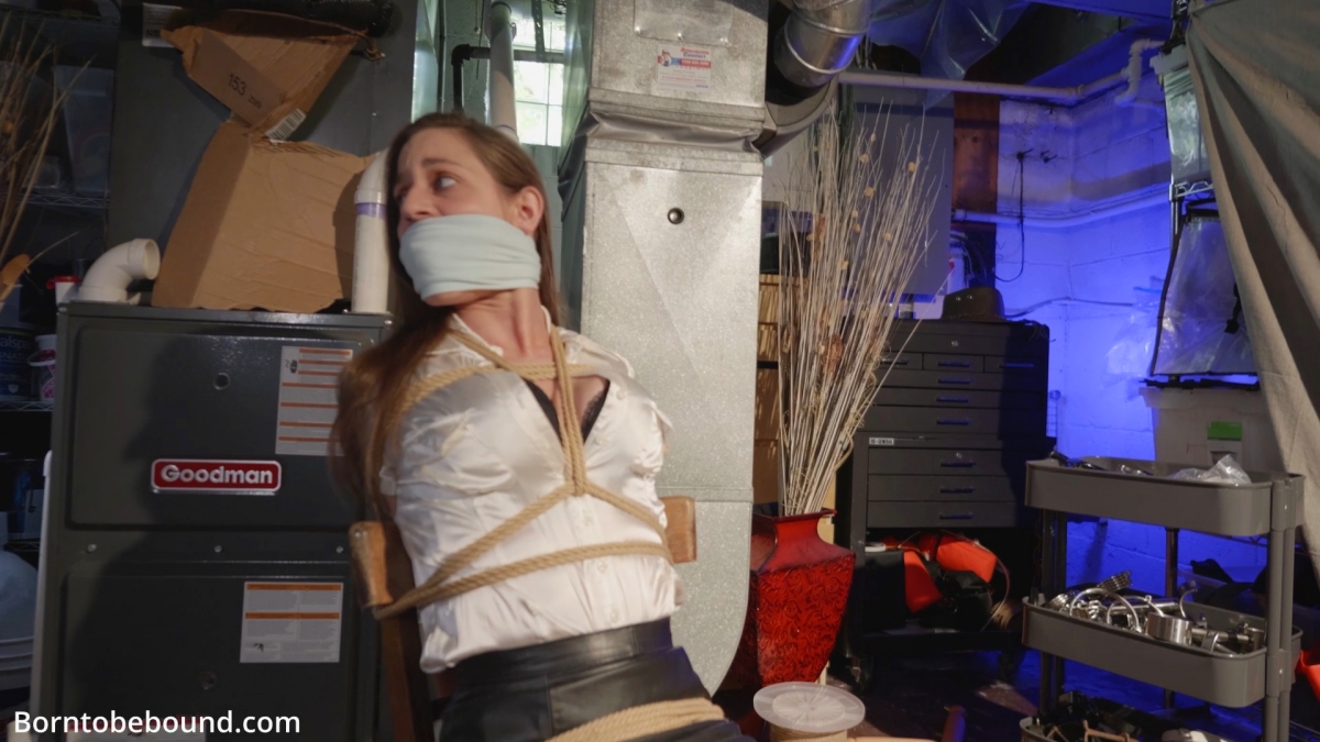 The woman decides to leave her in a basic hogtie to test her escaping ability. More tape is added to the gag and the woman locks her into the room but stays nearby. In no time Trixie has gotten the hogtie rope off and is up on her knees untying her ankles. Unfortunately for Trixie just when she thinks she will be able to break the door down and escape the woman comes in and subdues her again.