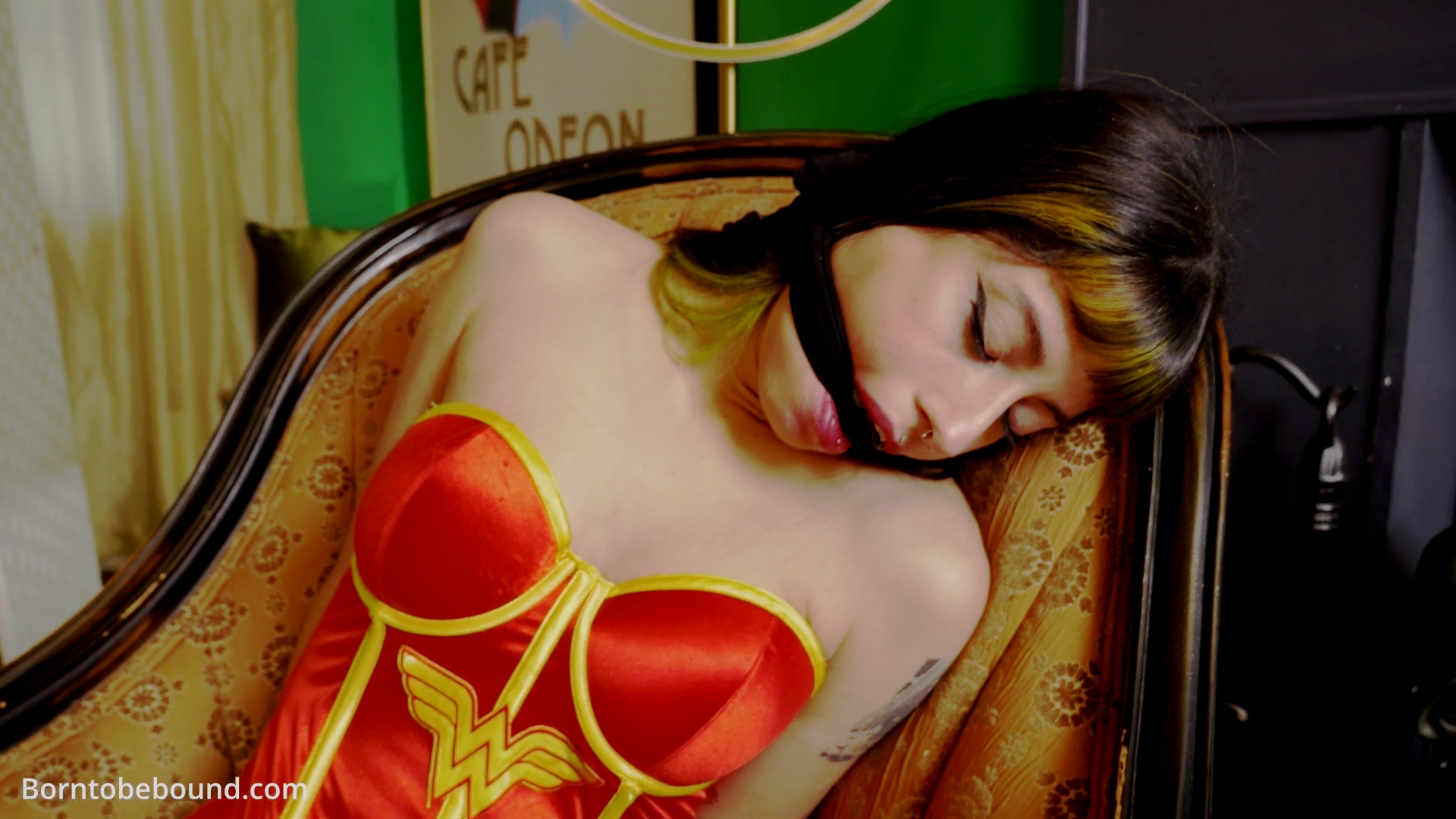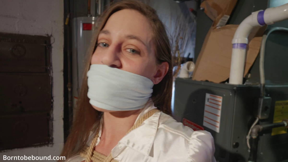 Trixie is now heavily cuffed up in a makeshift cell still gagged. The woman films her a bit and removes the gag in hopes of finding out who sent her but with no luck a black fabric is used as a cleave but since she is struggling so much she is told to lean up against the pipe, more cuffs are added and the gag is wrapped around the pipe. Once the woman is out of site she slips down the post slipping free of the cleave gag which didn’t prove to be a smart move…