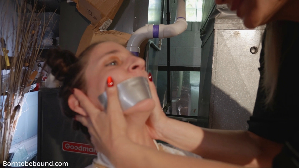 Victoria Vans is minding her own business at work when a woman in a sheer catsuit comes in and starts manhandling her and taping her up. She straps a ballgag between her teeth and escorts her out of the room. Now she is being led over to a wall where she is frisked. She is heavily taped to a chair and can only move her long legs, but she is moving too much for the woman who is keeping her bound. So she is cut off of the chair and hogtaped. Her cute little hands entirely covered in tape. The woman removes Victoria’s pricy red bottom heels and is delighted at the perfect fit. Victoria mmmphss about on the floor totally helpless and now blindfolded wondering what will come next.