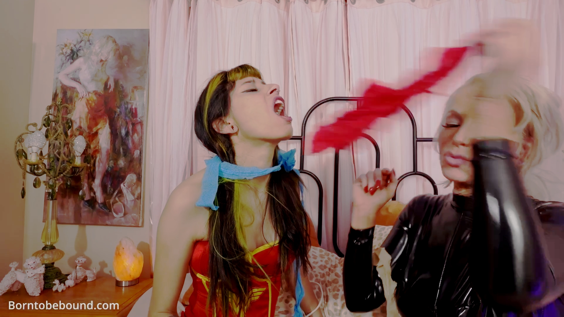 Trixie is now seen tightly bound to a chair (no tying on screen) with elbows tied and an over the mouth gag on. She struggles checking out her surroundings and when the woman comes in and removes the gag to ask some questions Trixie won’t talk. Her mouth is stuffed and strips of duct tape go over her face. More struggling happens and the woman removes her from the chair, pushes her up against the wall and spanks her over her satin panties. Her skirt is placed over her head and she is hopped out of the room as the woman holds onto Trixie’s ponytail.
