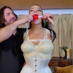 Tony is irritated at JJ for arriving so late. She is already in a bad mood because all of the stockings she tried on had bad runs and now he is giving her an attitude. She isn’t all smiles or making jokes today! She is wearing dyed Rago shapewear and a What Katie Did corset which should have put her into a great mood, but it didn’t Tony ties her up and ballgags her. She paces about in heels, she kneels on the couch and poses. He then hogties her and puts a nude stocking cap over her head with some nylon wrapped around her mouth for a cleave. He doesn’t mind watching her suffer.