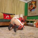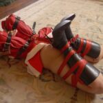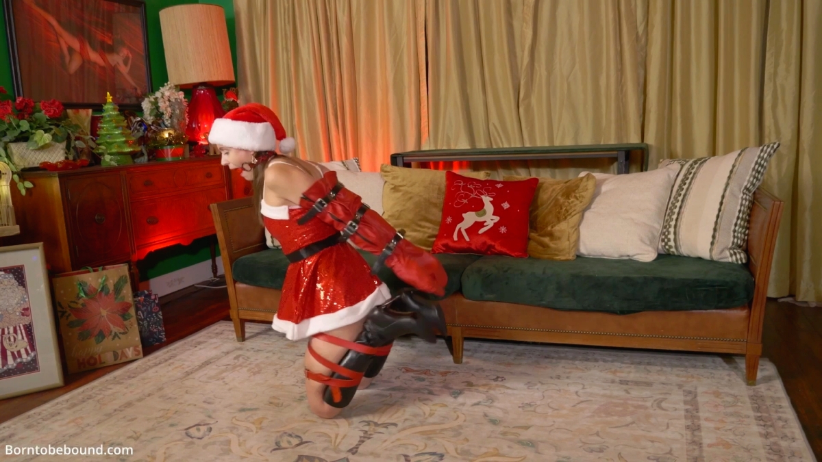 Rachel Adams is wearing real handcuffs lined with fluffy red fabric. She paces back and forth looking adorable in her sequined short dress and boots. I come in and hand her a ballgag to put in her mouth and then put her in some red leather bondage gear and watch her struggle around showing off her festive holiday panties. Then it is time for a hogtie and red blindfold. Wouldn’t you like to find her like this under your tree this year???