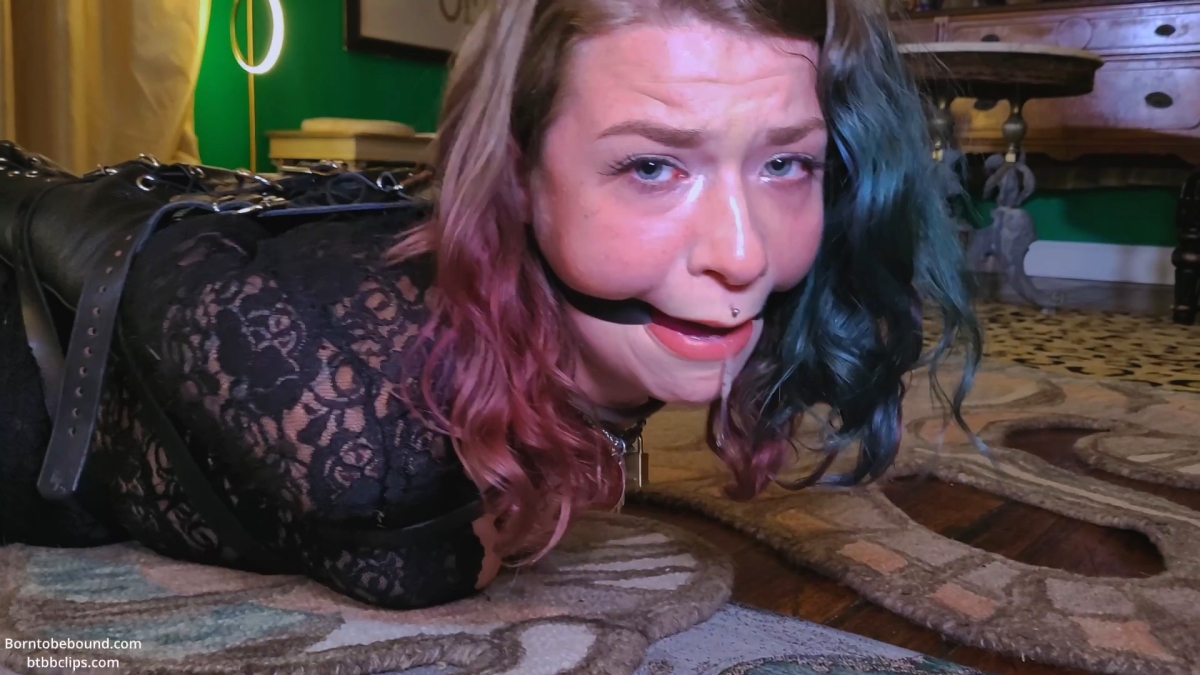 Emily struggles in leather bondage gear, shiny black pantyhose, black patent high heels, a lace bodysuit and purple ballgag for almost 4 minutes before I come in. I remove the strap keeping her hogtied and smack her with a high heel. I have 3 different dildos for her sucking pleasure and various positions to attempt. I start out with a clear one between my boobs. It works like a charm. Then she gets a big pink one that I have strapped on and then for the last one I like to imagine that is what mine would be like had I grown one myself 😉