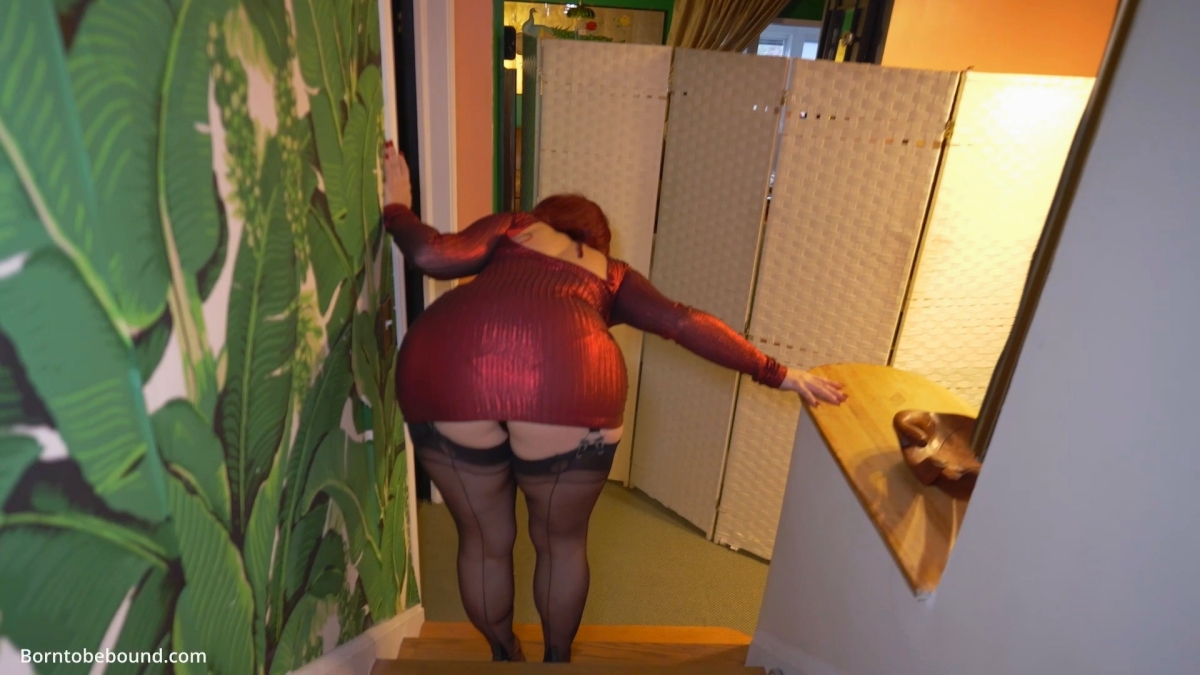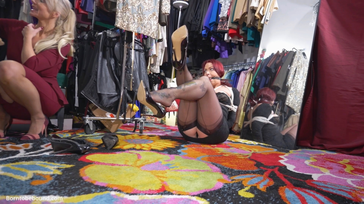 Cherry decides to start trying on some of JJs wardrobe and high heels with her garter belt, satin panties and fully fashioned stockings. She struts around in various 5 and 6 inch heels and tries on a few dresses. She leans over often giving us nice views. She prances down a hallway and even the steps. JJ comes up and accuses her friend of taking stuff without permission and she thinks a punishment is in order. She ties Cherry up and has her try on heels with her hands tied. She leads her around leashed up and then she takes her into a bedroom where she struggles on an old sofa and then gets hogtied while ballgagged. JJ wanders out of the room and Cherry squirms around and eventually gets the hogtie rope untied and sits up very proud of herself. JJ comes back in annoyed. She removes her own panties and replaces the ballgag in Cherry’s mouth with her panties, wrapping layers and layers of clear tape around her head before tipping her over and tying her into a little ball, which proves to be far more difficult for her to escape from.